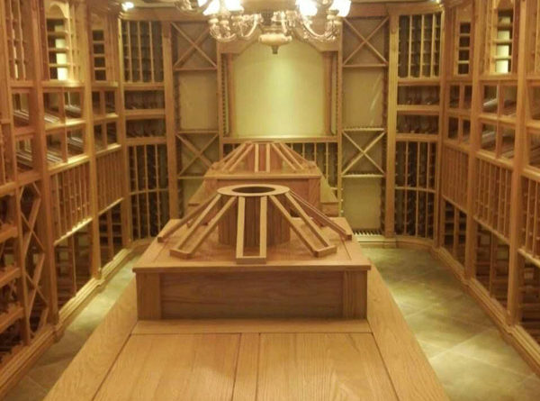 In the center, there are two island tables, which are made from all-heart oak wood. This natural wood pattern makes people feel just standing with the trees in the forest. And that’s why we suggest oak wood to clients for vintage or traditional cellar racks and cabinets. Its pattern is nice and elegant, it’s strong but modest.